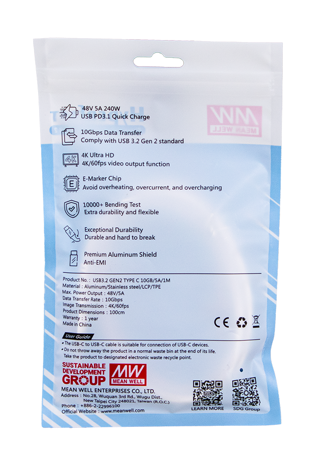 該產品采Type C to C設計, USB3.2 GEN2除了滿足48V/5A最大充電功率外,更具備10Gbps大量數據傳輸能力。此外,本產品適用于多種電子裝置的音源與影像數據傳輸,例如計算機、平板、行動硬盤、虛擬VR眼鏡…等。 具備快速充電,可同時傳輸大量數據的Type C充電/傳輸線,將是您工作或娛樂上的最佳選擇。