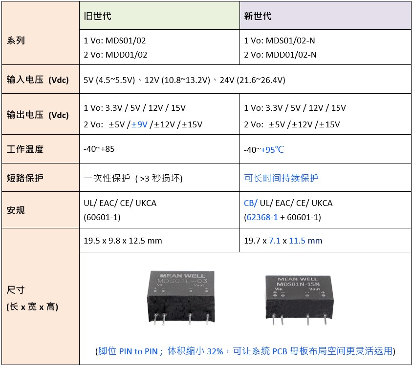 明緯模塊型醫(yī)療級DC-DC轉(zhuǎn)換器繼MDS01/02及MDD01/02系列后新上市性價(jià)比更好的MDS01/02-N、MDD01/02-N系列,新舊世代主要差異如下: