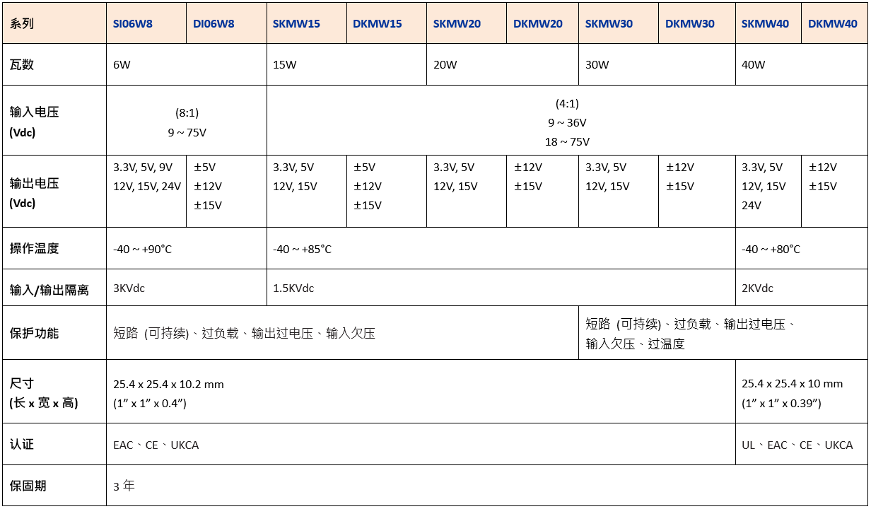 明緯繼推出 1" x 1" 6W/15W/20W/30W 寬壓輸入 DC-DC 轉換器后廣受好評,為滿足 1" x 1" 更高瓦數的需求,新推出了 4:1 輸入 40W 的單組輸出 SKMW40 及雙組輸出 DKMW40 系列。
