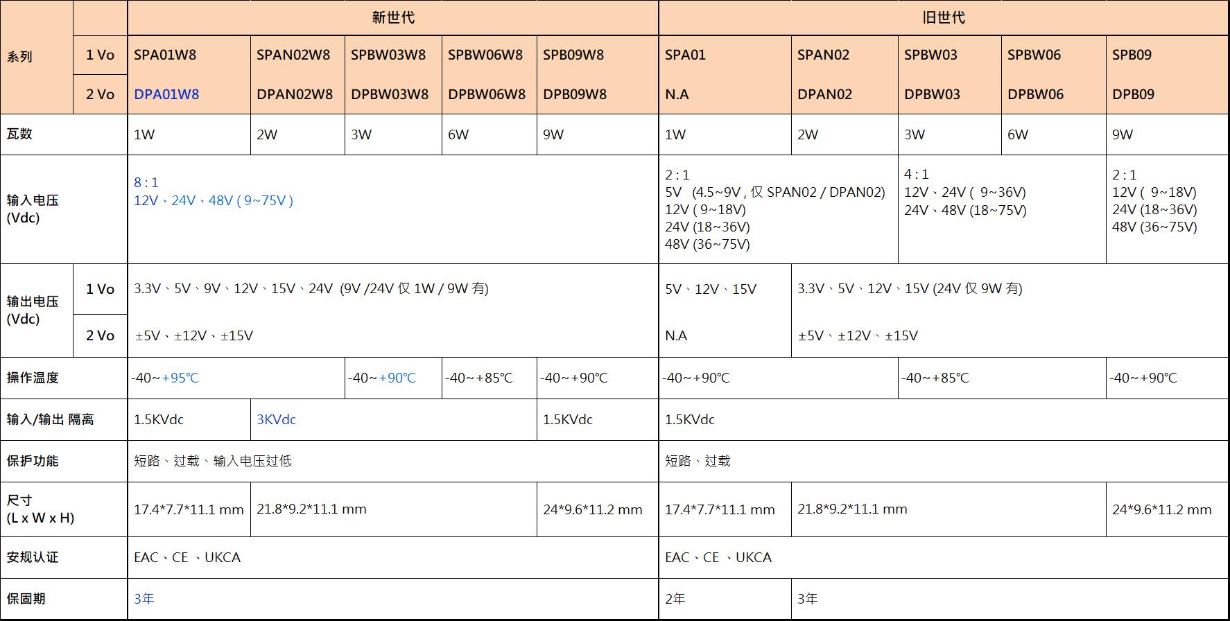 明緯 DC-DC 模塊型單組輸出 SPA01 / SPAN02 / SPBW03 / SPBW06 / SPB09 及雙組輸出 DPAN02 / DPBW03 / DPBW06 / DPB09 SIP 單排引腳封裝 1~9W 2:1 及 4:1 輸入機型上市多年,年銷數十萬臺,廣泛應用于電力、電子儀表、通信設備、工業自動化控制、IoT…等, 新上市超寬壓輸入單組輸出 SPA01W8 / SPAN02W8 / SPBW03W8 / SPBW06W8 / SPB09W8 及雙組輸出 DPA01W8 / DPAN02W8 / DPBW03W8 / DPBW06W8 / DPB09W8 等 5 系列,最大亮點為 8:1(9~75Vdc)超寬壓輸入范圍,不僅可滿足更寬輸入電壓需求,更因輸入范圍統一為 9~75Vdc,機型選擇大幅簡化,讓選型變得更容易。新品 5 系列引腳與舊品兼容,可讓終端設備設計者以新代舊無痛替換,新 vs 舊世代主要特點及規格差異請參考下表: