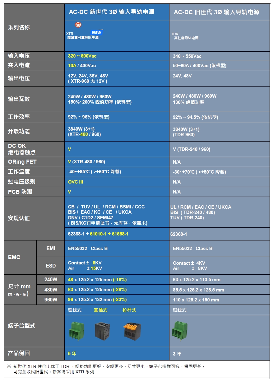全新XTR系列在尺寸、效率、功能規(guī)格、保固期、安規(guī)認證及價格等方面,全面優(yōu)于舊世代 TDR 系列,具備更高性價比,可完全取代TDR系列。主要升級差異包括: