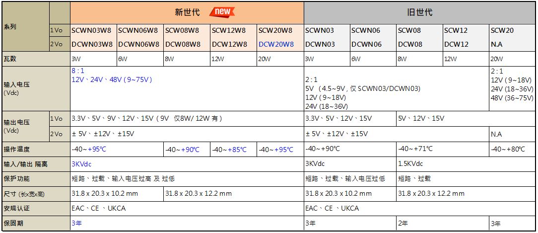 明緯DC-DC模塊型單組輸出SCWN03/ SCWN06 / SCW08 / SCW12 / SCW20及雙組輸出DCWN03 / DCWN06 / DCW08 / DCW12 DIP 雙排標(biāo)準(zhǔn)引腳封裝3~20W 2:1 輸入機(jī)型上市多年,年銷數(shù)十萬(wàn)臺(tái),廣泛應(yīng)用于電力、電子儀表、通信設(shè)備、工業(yè)自動(dòng)化控制、IoT…等, 新上市次世代8:1輸入超寬壓輸入單組輸出 SCWN03W8/ SCWN06W8 / SCW08W8 / SCW12W8 / SCW20W8及雙組輸出 DCWN03W8 / DCWN06W8 / DCW08W8 / DCW12W8/ DCW20W8共5系列。