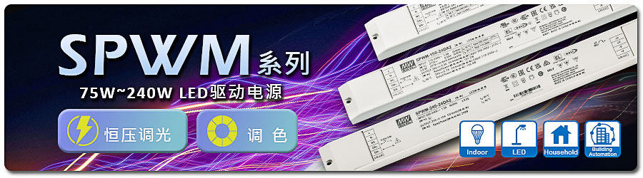 明緯深耕 LED 照明驅動與應用領域多年,自推出PWM系列恒壓調光LED驅動電源后,獲得良好的市場反響,現接續推出SPWM系列恒壓調光/調色的機型,與原有的PWM系列構成互補關系,進一步豐富恒壓調光/調色的LED驅動電源產品線。