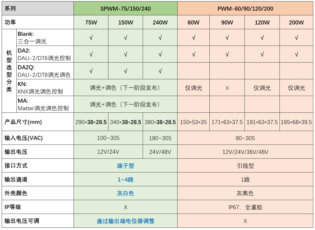 PWM系列與SPWM系列的選型比較表如下: