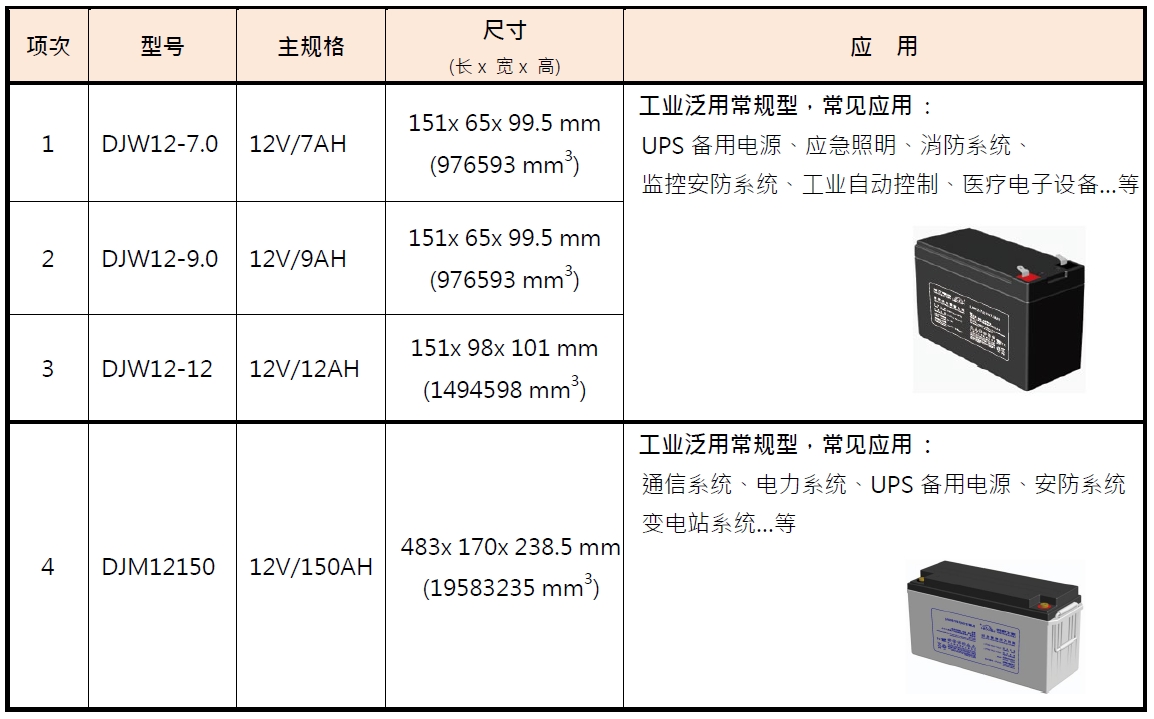 DJW / DJM系列: 12V/7~12AH & 150AH 閥控式密封免保養鉛酸電池